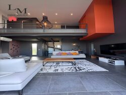 À l'étage, une élégante passerelle mezzanine dessert : une chambre avec dressing, une chambre d'amis, une suite parentale avec dressing et salle de bain privative, bénéficiant d'un toit-terrasse privatif, une salle d'eau avec WC. Un garage double de 35 m² permet d'accueillir confortablement deux véhicules.