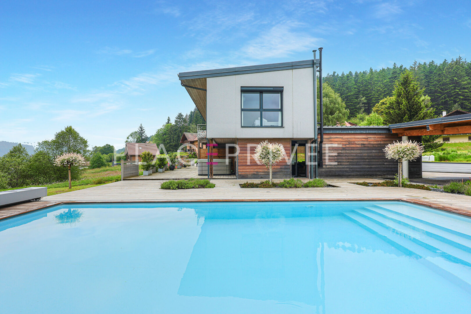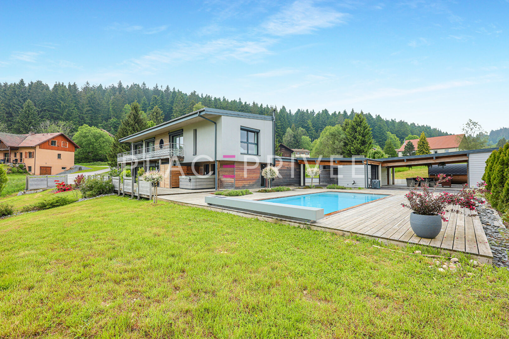 A Gérardmer "les Xettes", vue sur le lac - Vend une maison d'architecte 5 pièces avec terrain 2000m2 et garage. UNIQUE - Située sur le coteau des Xettes, plein sud, le plus prisé de Gérardmer, cette maison d'architecte construite en 1999 sur une parcelle de terrain de 2000m2 s'inspire du concept Le Corbusier de la "maison à vivre". L'architecture est toute aussi technique qu'esthétique. L'harmonie entre la maison et son environnement est essentielle. L'innovation et l'audace de cette maison résident aussi dans l'emploi des matériaux industriels comme l'acier, le verre et le béton armé. D'une surface habitable de 188m2, la maison délivre en rez-de-jardin un spacieux salon/séjour de 54m2 équipé d'un poêle à bois, une cuisine fonctionnelle toute équipée jouissant d'une vue panoramique sur la vallée et le lac, une chambre parentale climatisée avec sa salle bain en marbre rose du Portugal, wc invités avec vestiaire et une belle terrasse en granit brut de Norvège ombragée pour vos repas en famille et entre amis. La décoration intérieure est soignée. La qualité haut de gamme des matériaux et des équipements confère à cet intérieur une ambiance intemporelle et contemporaine : calepinage des murs en bois, sol en granit de Norvège, fenêtres en vitrerie VEK pour le design et l'efficacité énergétique. La lumière naturelle envahit chaque espace. Le 1er étage vous offre une chambre ou un bureau. En rez-de-chaussée, vous disposez de deux chambres, une salle de bain, un wc, cellier, une cave à vin et d'autres espaces techniques. Pour vous stationner, vous bénéficiez d'un garage, un carport et plusieurs emplacements devant la maison. Toiture en acier inoxydable, volets motorisés, chauffage au gaz - DPE D Une adresse singulière à vivre, clé en main, à 800m d'altitude. Une exclusivité Place Privée. Les informations sur les risques auxquels ce bien est exposé sont disponibles sur le site Géorisques : www.georisques.gouv.fr.