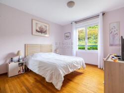 À l'extérieur, deux places de stationnement supplémentaires sont disponibles à l'avant, tandis qu'à l'arrière, une grande terrasse de près de 60 m² s'ouvre sur un jardin arboré, sans vis-à-vis et offrant une vue totalement dégagée.