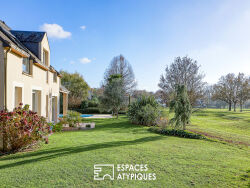 Nichée dans un environnement calme et privilégié au Golf de Cholet, cette maison déploie 180m² de surface habitable sur une parcelle paysagée de 1000m². Cette maison d'architecte se distingue par ses volumes généreux et sa vue offrant un horizon ouvert sur le Golf. Un équilibre parfait entre confort et luminosité, pensé pour une vie familiale. Le hall d'entrée conduit à un espace de vie généreux, un salon avec cheminée et une salle à manger, où les baies vitrées dévoilent une vue imprenable et inondent les espaces de lumière naturelle. Attenante et pouvant s'ouvrir, la cuisine est fonctionnelle. Un dégagement conduit au premier espace nuit composé d'une suite parentale avec dressing et salle de bain et d'une deuxième chambre. Ce niveau est complété également d'une lingerie et des espaces de rangements. A l'étage, un palier dessert trois chambres supplémentaires, accompagnées d'une salle de bain, et d'un bureau. Le bien profite d'une terrasse ensoleillée exposée plein sud, sans vis-à-vis, ainsi que d'un agréable jardin avec piscine, véritable havre de paix. Ces espaces extérieurs prolongent naturellement les volumes intérieurs et offrent un cadre idéal pour profiter d'un panorama à perte de vue. Stationnements avec Garage et carport. Cette propriété se situe à 8 minutes du centre ville de Cholet, à 55 mn de Nantes, d'Angers et des Sables d'Olonne. CLASSE ÉNERGIE : C / CLASSE CLIMAT : C Montant moyen estimé des dépenses annuelles d'énergie pour un usage standard établi à partir des prix de l'énergie de l'année 2021 compris entre 1580 euros et 2220 euros. Contact : Marine Caillaud 06 70 65 43 99 Agent commercial EI immatriculé au RSAC d'Angers sous le numéro 912 830 619. Les honoraires sont à la charge du vendeur. Les informations sur les risques auxquels ce bien est exposé sont disponibles sur le site Géorisques pour les zones concernées: www.georisques.gouv.fr