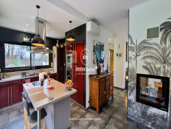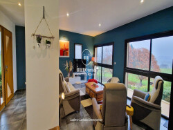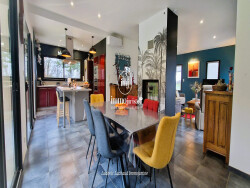 Elle est composée au rez-de-chaussée, d'une entrée avec placard, d'une magnifique pièce de vie très lumineuse grâce à ces grandes ouvertures, d'une cuisine américaine aménagée et équipée avec cellier et d'un coin bar. Pour les amoureux du feu de bois, un insert double face est installé au milieu de la pièce de vie. Une belle terrasse agrémente cette partie jour avec son store banne de 8m. La partie nuit est agréable avec ces deux chambres dont une avec dressing et son accès à la terrasse, sa grande salle de bains et son w.c séparé. Le sous-sol est aménagé d'un sas qui dessert deux chambres, une salle d'eau et un w.c séparé. Vous aurez la possibilité de garer 3 voitures avec son double garage et un garage indépendant. Pour les amateurs de vins une cave est à votre disposition. Elle est édifiée sur une parcelle de 9127m² entièrement clôturée avec portail électrique et portillon. Des plantations de fleurs et d'arbustes harmonisent les extérieurs ainsi que des arbres fruitiers avec un bassin artificiel. Les bonus sont : - ZERO TRAVAUX !!! - Un puit qui alimente un goutte à goutte pour les plantations - Le chauffage au sol par géothermie - La climatisation - Des grands espaces - Des matériaux de qualité.