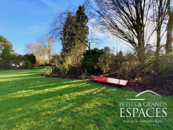Chauffage central gaz de ville (chaudière De Dietrich, sous contrat d'entretien). Sous-sol complet et extérieurs : Le sous-sol sain comprend un garage pour trois véhicules, une chaufferie et quatre caves. À l'extérieur, le terrain paysagé propose :