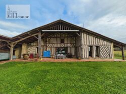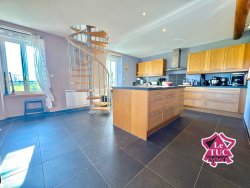 À l'étage, un couloir donnant sur un WC de jour, puis le majestueux salon, salle à manger, cuisine équipée avec plafond cathédrale sous la magnifique charpente. Espace bureau de 12 m2 en mezzanine très pratique pour du télétravail ou chambre.