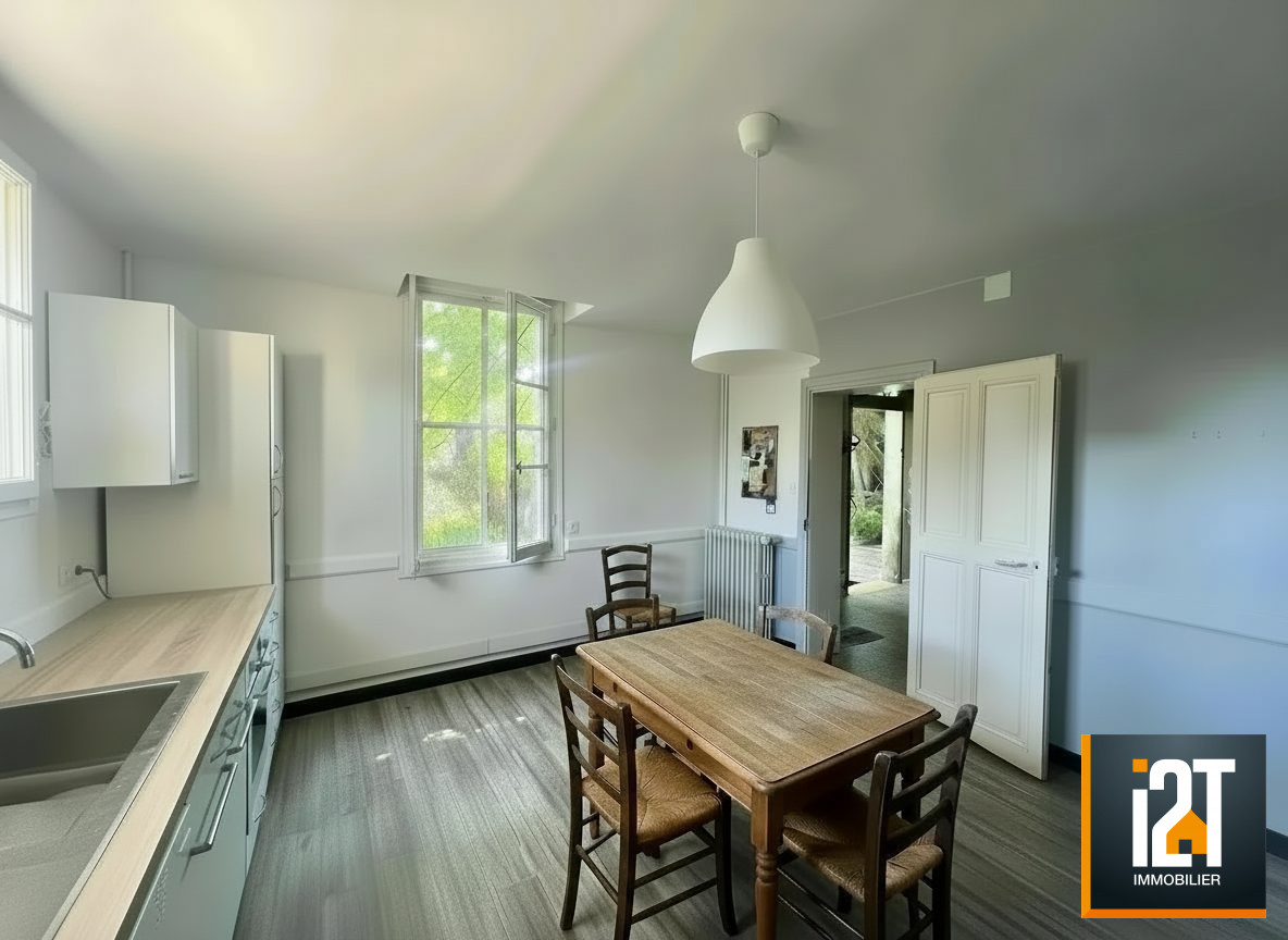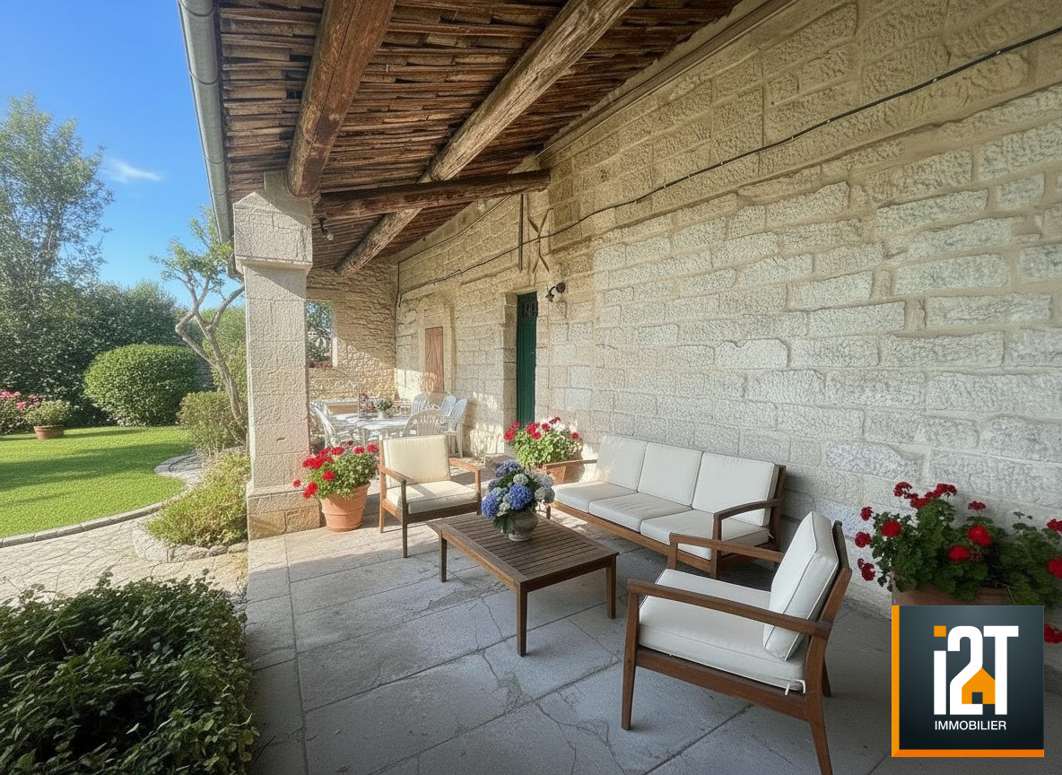 Le coeur de la maison s'organise autour d'un vaste salon aux volumes généreux, sublimé par un plafond cathédrale et une cheminée insert qui invite à la convivialité. La cuisine indépendante, prolongée par son cellier, s'ouvre sur une terrasse intime, idéale pour les repas d'été. Un bureau, une buanderie, et des espaces fonctionnels viennent compléter cet ensemble pensé pour le confort du quotidien.