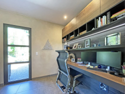À l'extérieur, les terrasses filantes couvertes -- près de 75 m2 -- enveloppent la maison et invitent à savourer chaque moment de la journée, tandis qu'une piscine de nage de 12 x 4 m s'étire dans le jardin comme une promesse de fraîcheur. Deux terrasses supplémentaires, en lien direct avec la cuisine et une chambre, offrent des refuges plus confidentiels.