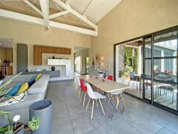 Dès les premiers pas, le dialogue subtil entre le minéral et le végétal s'impose comme une évidence. Les lignes contemporaines s'effacent délicatement au profit d'une harmonie naturelle, où chaque espace semble prolonger le jardin. Les larges baies vitrées laissent entrer la lumière à flots et brouillent les frontières entre intérieur et extérieur, offrant ce sentiment précieux de vivre dedans comme dehors.