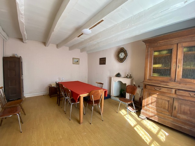 Maison d'habitation mitoyenne de 110m² , construite avant les années 1950, en pierre recouverte d'ardoise et fibro. Comprenant : Une entrée , un séjour avec cheminée, une cuisine, un WC, un cellier, une cave et un garage attenant . A l'étage: un pallier mezzanine, 3 chambres, une salle de bain WC, un grenier et un débarras. Grenier aménageable.