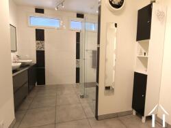 La salle d'eau est très grande car elle a été conçue pour y installer un sauna. On pourrait, si on le souhaitait y installer une grande baignoire en plus de la douche qui est prévue pour accueillir une chaise roulante.
