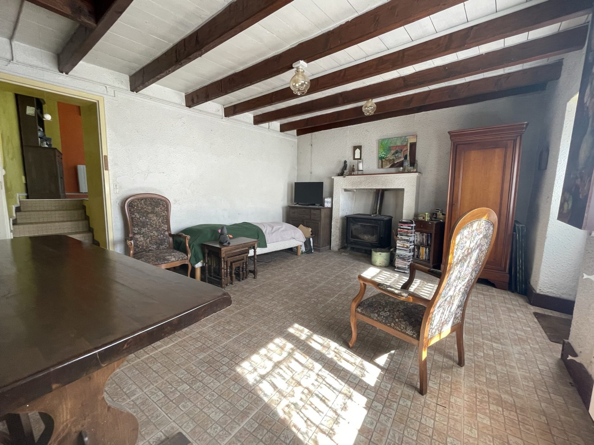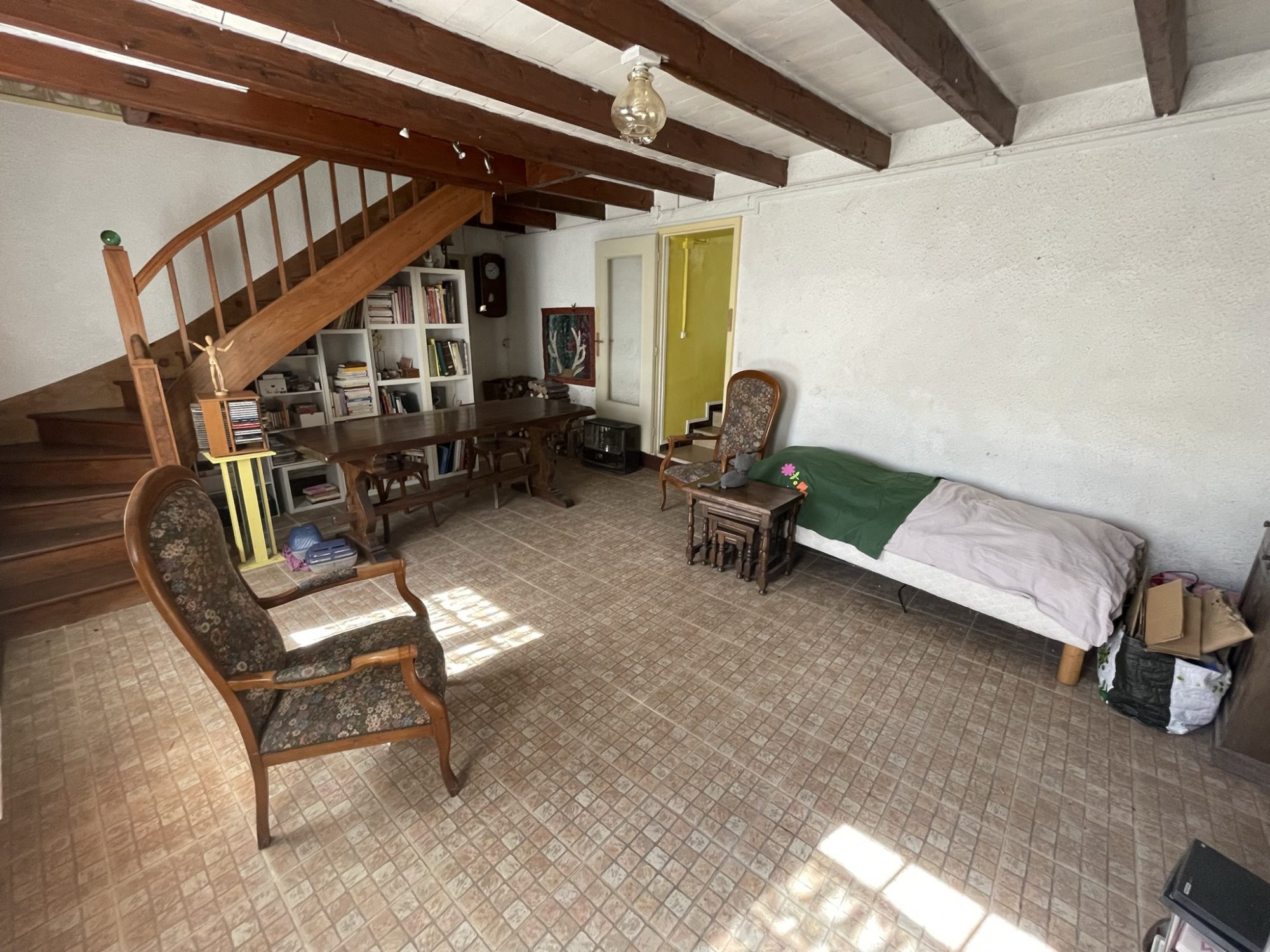 Le rez-de-chaussée comprend une pièce de vie d'environ 40 m2 avec cuisine ouverte. Cet espace s'ouvre directement sur la cour, créant une continuité agréable entre intérieur et extérieur. La cour dispose également d'une dépendance pouvant être aménagée en cuisine d'été, atelier ou espace de rangement. Une salle d'eau et un WC complètent ce niveau.