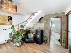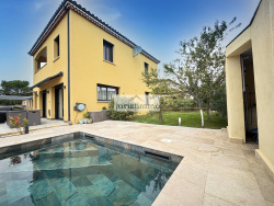 oÉtage : oDeux chambres dont une avec balcon. oUn bureau. oUne salle d'eau. Extérieur : oPiscine de 8,3 x 3,5 X1,6. oTerrasse avec store. oGarage. Caractéristiques techniques : oFenêtres en aluminium double vitrage. oChauffe-eau thermodynamique. oChauffage au sol avec poêle à granulés. oPortail et porte de garage électriques. oVolets roulants centralisés. Informations financières : oTaxe foncière : 1526 EUR par an.