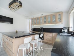 Dans le prolongement de l'entrée, vous accédez à une spacieuse cuisine familiale, aménagée et équipée, véritable coeur de la maison donnant accès ensuite à un salon chaleureux et lumineux. La cuisine comme le salon bénéficient d'un accès direct à l'extérieur, créant une belle continuité entre les espaces intérieurs et le jardin.