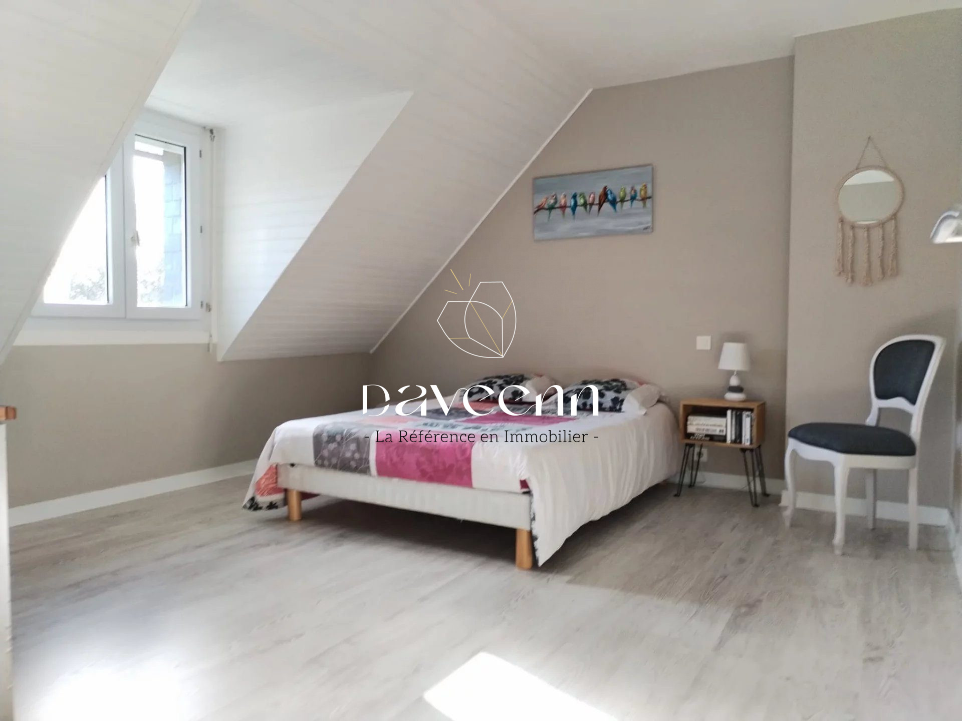 Au rez-de-chaussée, une vaste chambre lumineuse, une salle d'eau élégante, un WC indépendant, un salon-séjour accueillant et une cuisine équipée avec îlot forment un espace de vie pratique et convivial.