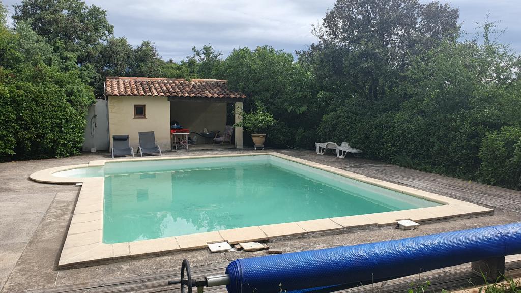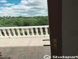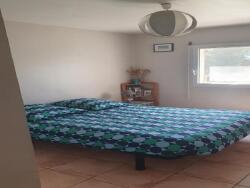 Chambre à louer pour étudiante avec douche privative et terrasse, un lit double, grand placard pour rangement, un grand jardin et piscine hors sol.
