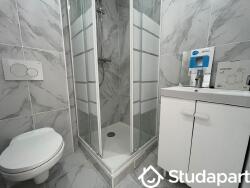 Salle de bains avec douche, miroir, lavabo, toilettes et rangements.