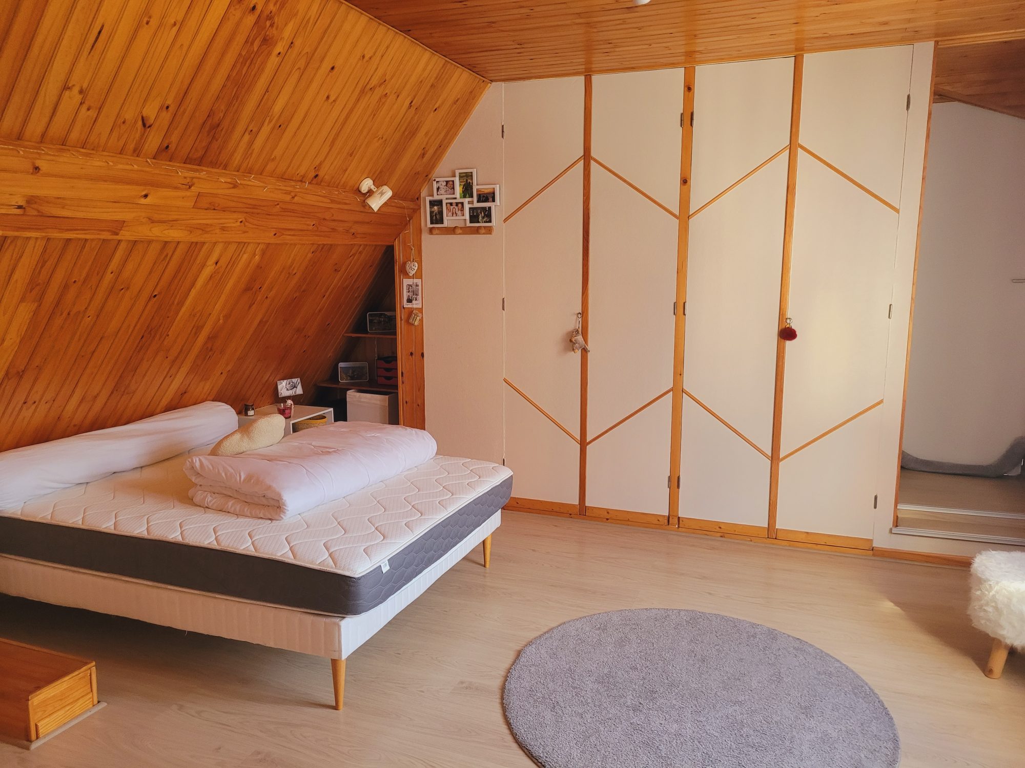 À l'étage : Le palier spacieux offre un bel espace de convivialité. Il dessert 4 chambres confortables, dont une disposant de sa propre terrasse privative, ainsi qu'une salle d'eau et un WC.