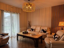 Elle se compose en rez-de-chaussée d'une entrée spacieuse avec rangement, un salon cosy, une grande cuisine aménagée & équipée ouverte sur un vaste séjour lumineux. Accès à la terrasse exposée plein SUD. A noter que les garages et la buanderie sont accessibles depuis la cuisine ainsi que de l'extérieur. De plus, une chambre, une salle de bains et wc indépendant.