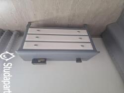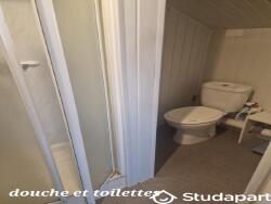 Chambre meublée avec lit 140, table, rangement, TV, douche, lavabo et WC attenant à la chambre.