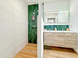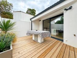 Elle se compose d'une pièce de vie avec cuisine aménagée et équipée donnant sur une terrasse en bois idéale pour profiter du soleil à l'abri des regards, deux chambres lumineuses, un dégagement, une salle d'eau et un wc séparé.