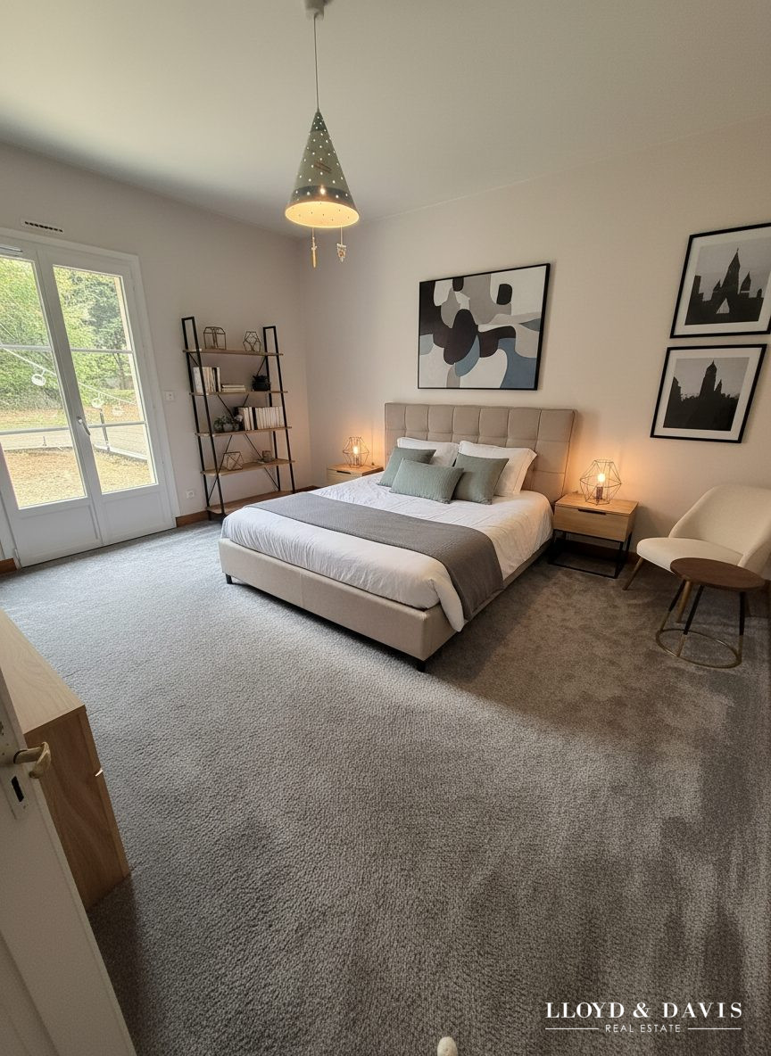 Le rez-de-chaussée propose également un espace nuit de plain-pied particulièrement confortable, comprenant deux chambres, une salle d'eau, ainsi qu'une somptueuse suite parentale disposant d'un dressing sur mesure et d'une salle de bains privative, offrant un véritable espace indépendant et intimiste.