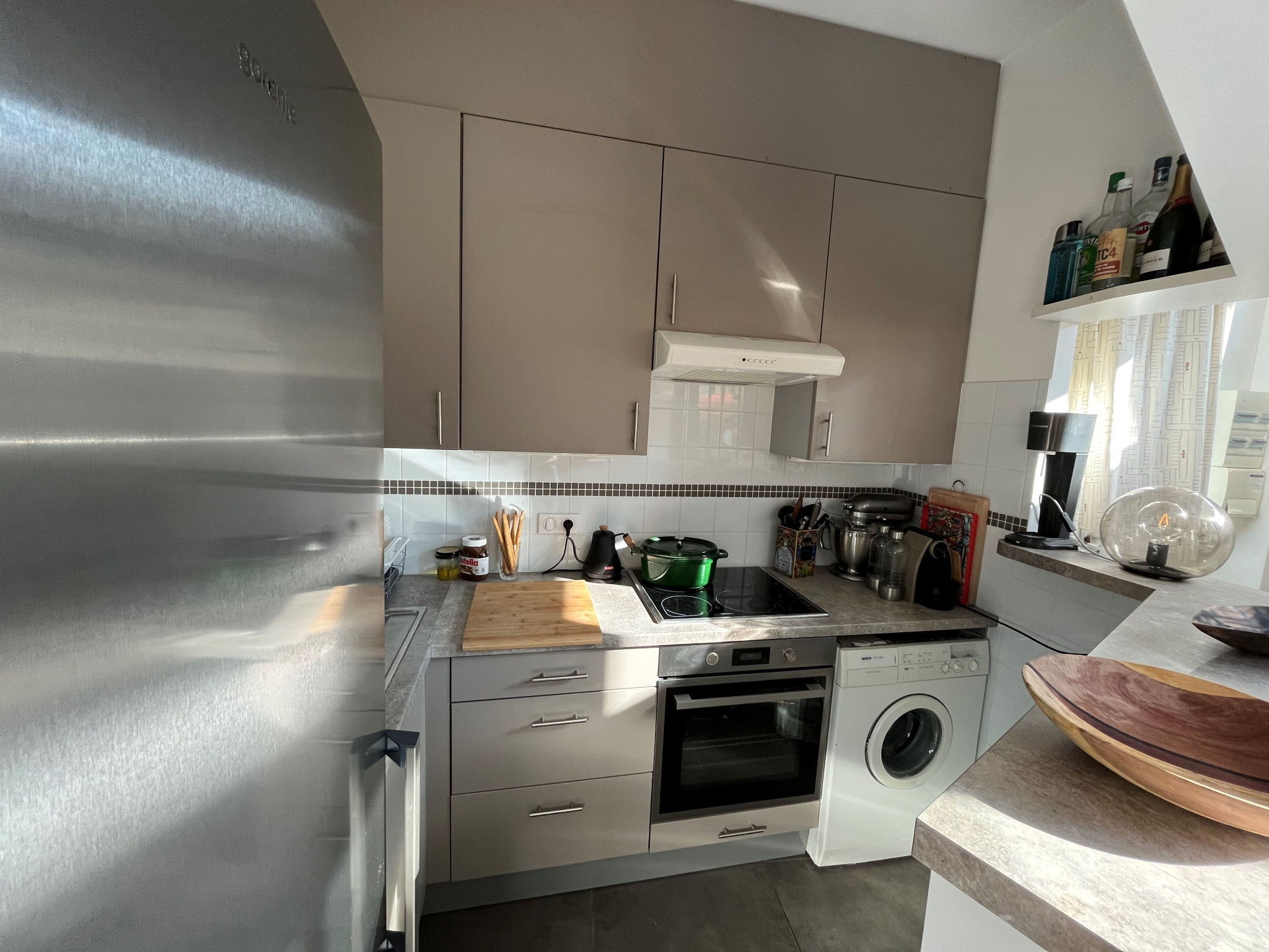 - Cuisine équipée : plaque de cuisson, hotte, four, ustensiles de cuisine, rangements.