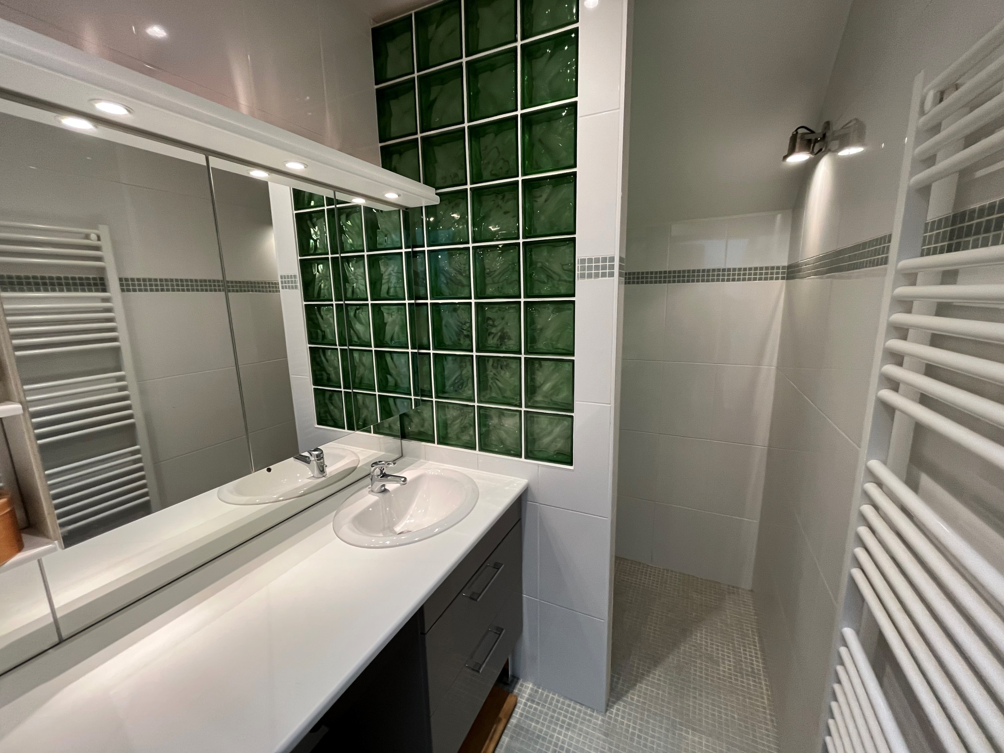 - Salle d'eau : douche, lavabo, machine à laver, sèche serviette, rangements.