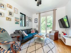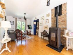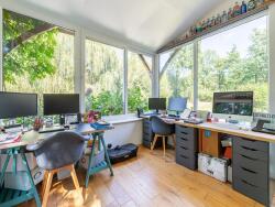 L'espace de vie de 50 m2 baigné de lumière s'ouvre sur la terrasse et offre un salon avec poêle à granulés, une salle à manger, une cuisine aménagée équipée. Deux chambres de plain pied dont une suite parentale avec dressing, un bureau, une salle d'eau, toilette, une buanderie.
