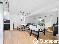 Au RDC : cuisine totalement équipée avec lave vaisselle salle à manger salon avec Grand écran tv, baby foot et Console vidéo Rangement et WC Parquet massif