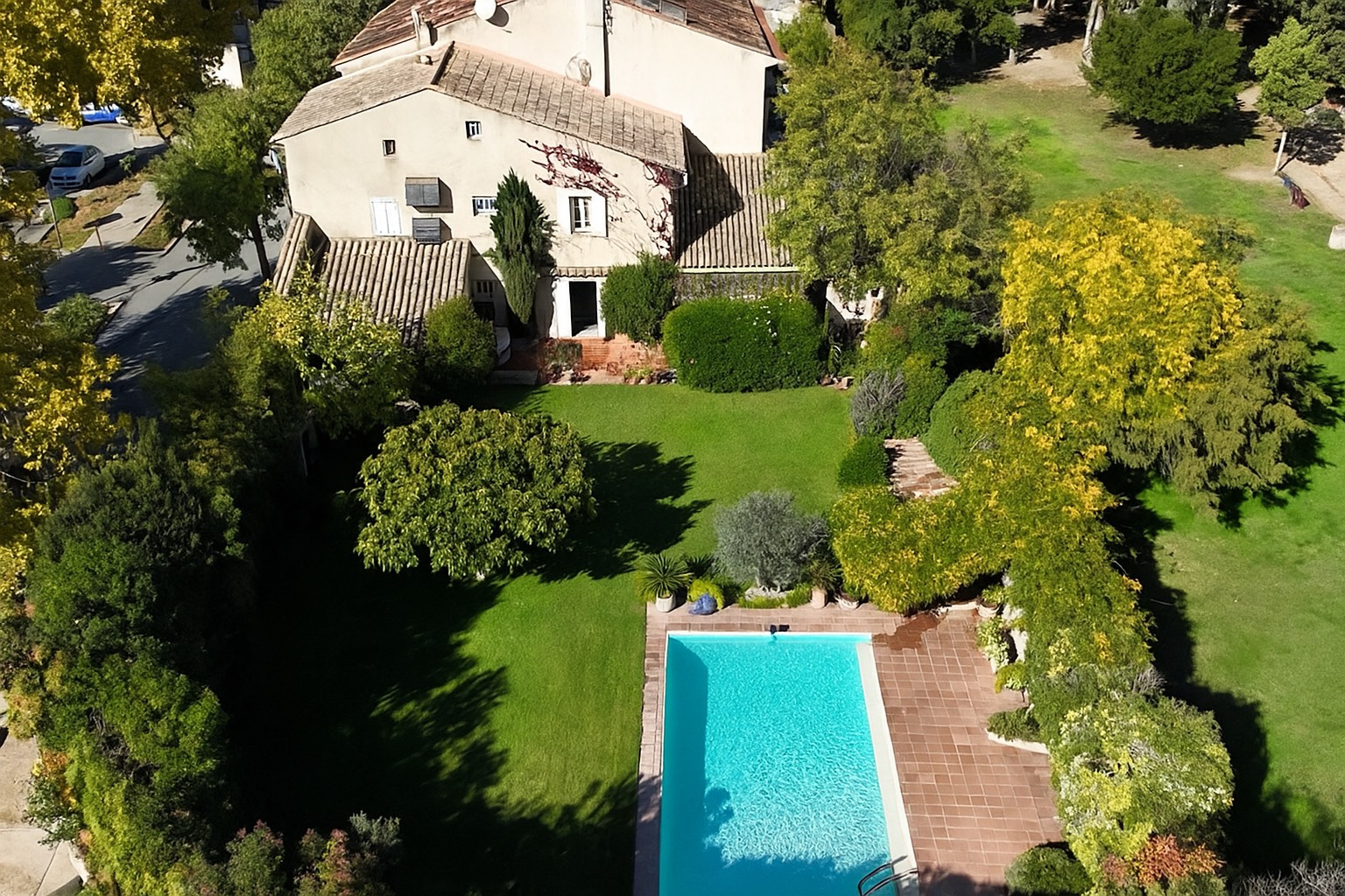 Côté stationnement, une large allée en enrobé peut accueillir plus d'une dizaine de véhicules, un véritable atout pour recevoir sans contrainte. Les prestations sont au rendez-vous : climatisation intégrale, poêle à granulés (2017), portail motorisé, forage avec arrosage automatique, chauffe-eau thermodynamique, travertin dans la pièce de vie, façade refaite en 2022, volets roulants solaires et centralisés, et une exposition plein sud garantissant luminosité et confort.