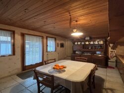 Cette maison comporte : Séjour salon avec insert bois qui chauffe la totalité de la maison, cuisine aménagée, salle de bain et wc indépendant.