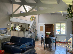 La maison propose une belle pièce de vie de 35 m² avec charpente apparente et un accès à la terrasse par baie vitrée, la cuisine labo ouverte sue la salle à manger de 41 m² avec un insert, offre un bel espace et un accès extérieur, grande salle d'eau, deux chambres, wc, placard, chaufferie. A l'étage, une troisème chambre sous rampant avec placards.