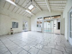 Une fois l'entrée franchie, vous découvrirez sur votre gauche une spacieuse cuisine dinatoire aménagée de 26 m² ouverte sur une salle à manger avec cheminée offrant un espace de réception convivial et chaleureux de 24 m2 ainsi qu'un agréable salon de 46 m² baigné de lumière et donnant accès à une piscine couverte.