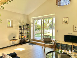 Le rez-de-chaussée accueille une entrée avec rangements intégrés, une buanderie, des toilettes indépendantes, ainsi qu'une suite parentale dotée de sa salle d'eau privative et de son dressing. La pièce de vie, baignée de lumière, séduit par ses généreux volumes et sa cuisine ouverte entièrement équipée. Elle s'ouvre naturellement sur un jardin confidentiel, agrémenté d'une vaste terrasse, d'un espace détente et d'une piscine.