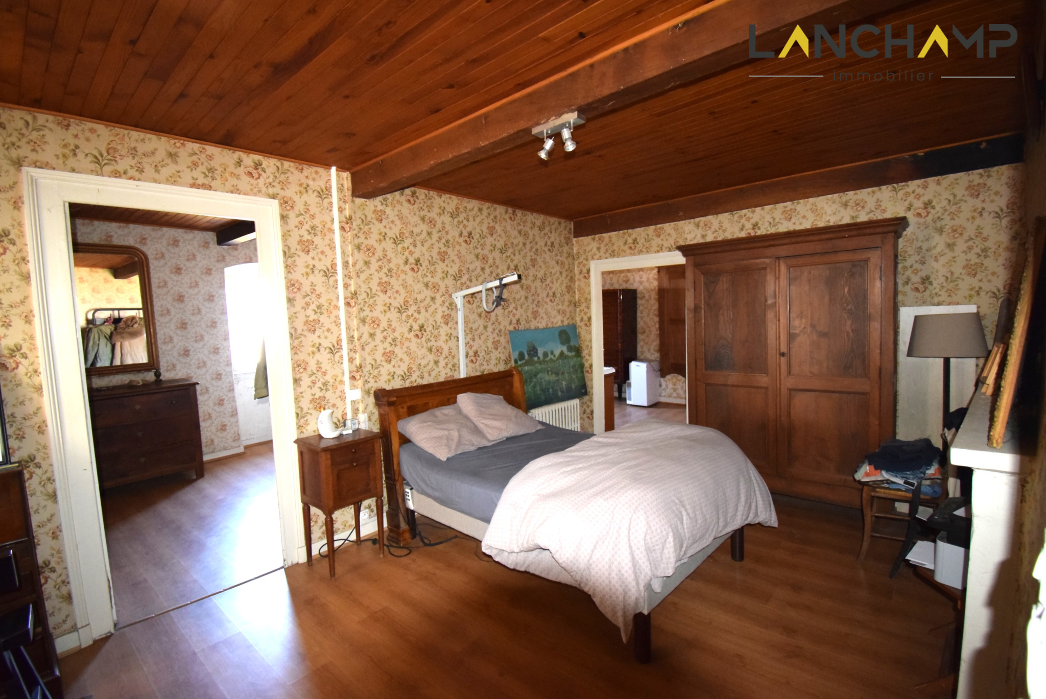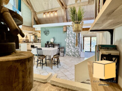A l'étage principal, nous arrivons tout de suite dans une immense pièce de vie de plus de 80m² avec plafond cathédrale laissant apparaître une imposante charpente traditionnelle, pièce maîtresse de cette habitation. Cette pièce de vie entièrement ouverte sur les différents espaces offre un coin séjour intimiste avec cheminée avec insert, une cuisine équipée, un magnifique ancien pressoir. Cette grande pièce est chauffée par un poêle à granulés de bois, installé récemment. Un bureau, ainsi qu'une salle d'eau WC entièrement rénovée viennent compléter cet étage.