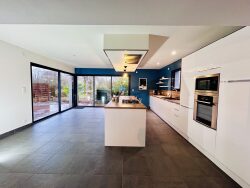 Au rez-de-chaussée, une spacieuse pièce de vie de 64 m² avec salon, séjour équipé d'un poêle à bois et grande cuisine ouverte aménagée équipée. L'ensemble donnant sur une belle terrasse coté jardin.
