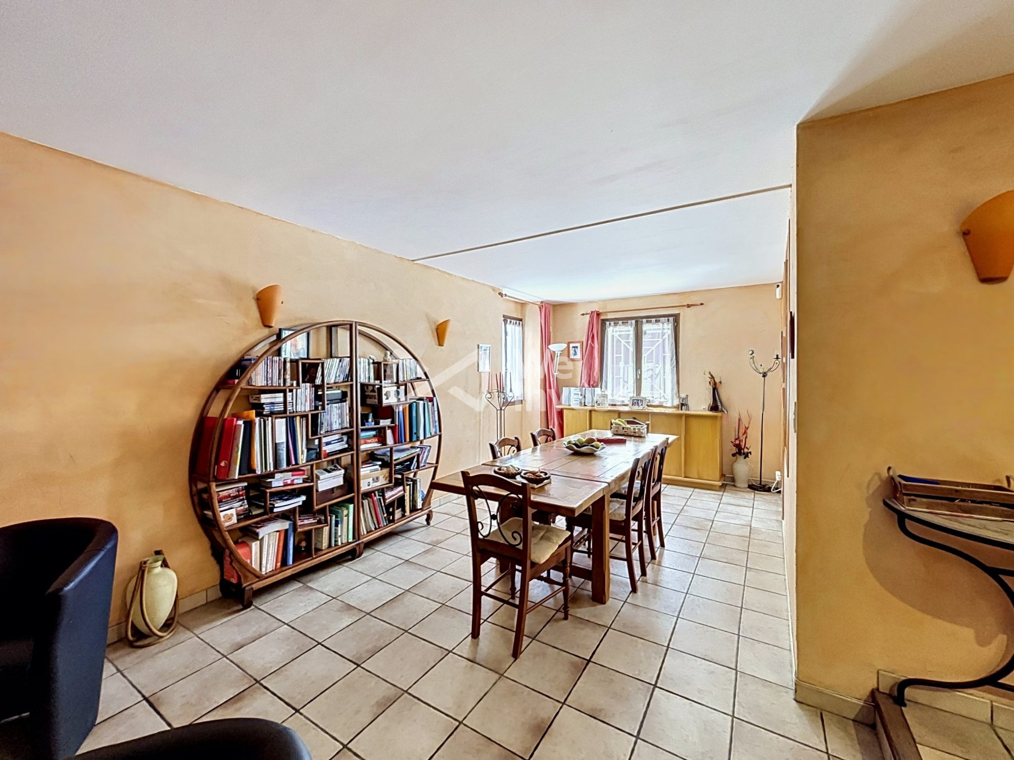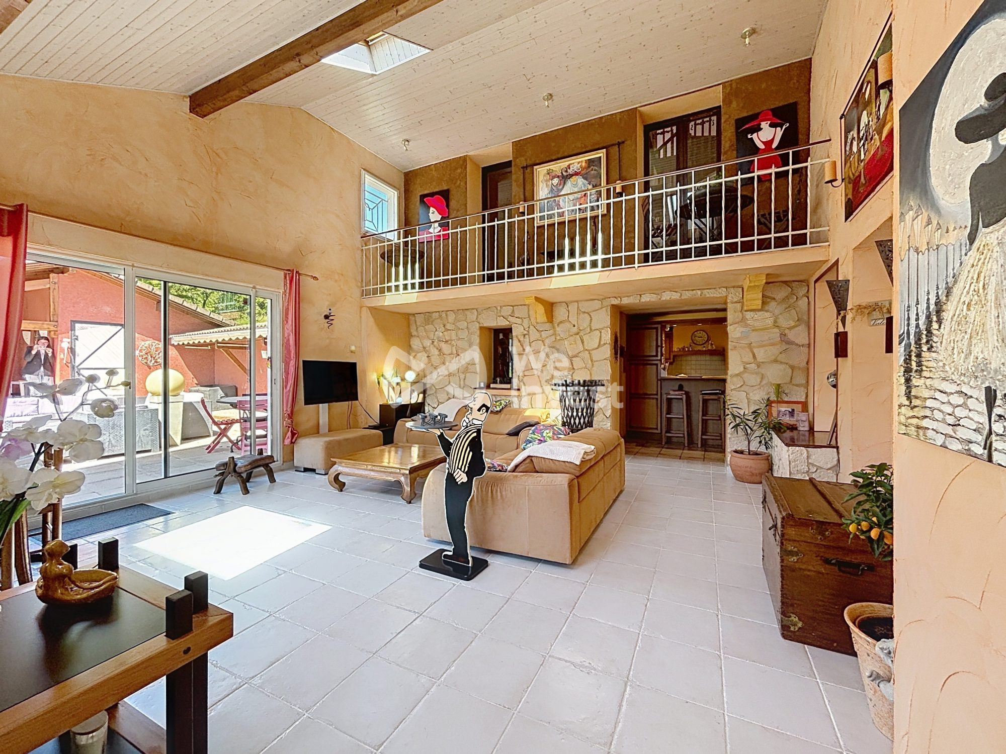Cuisine indépendante rénovée Salle à manger Lumineux salon/séjour cathédrale avec cheminée, accès direct à la terrasse exposée plein sud Salle d'eau rénovée WC indépendant Cave / cellier