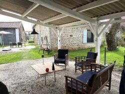 MAISON DE CHARME AVEC GRANGE, TERRASSE COUVERTE ET TERRAIN Environnement calme pour cette maison de campagne, rénovée avec goût, ayant conservé les éléments anciens (poutres, sol en coeur de demoiselle, cheminée, pierres apparentes) comprenant au rez-de-chaussée : hall d'entrée - cuisine aménagée et équipée /salle à manger de 30 m² avec cuisinière bois donnant accès à la cour intérieure et la terrasse couverte chambre avec placards de 17 m² buanderie/salle d'eau avec WC salon de 31 m² avec poêle à bois. A l'étage : grande pièce de 82 m² à finir d'aménager (isolation posée et velux neufs) - prévoir aménagement et répartition des pièces. Double vitrage PVC avec volets bois chauffe-eau électrique Chauffage bois et pompe à chaleur air/air réversible - couverture de 2021 - assainissement individuel. Grange avec petit toit + appentis bois. Citerne avec pompe. Cour intérieure avec terrasse couverte et terrain attenant L'ensemble sur une surface totale de 5 439 m²
