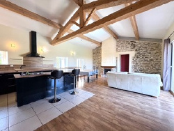Un lumineux séjour/cuisine de 50 m2, ouvert sur la terrasse et la piscine