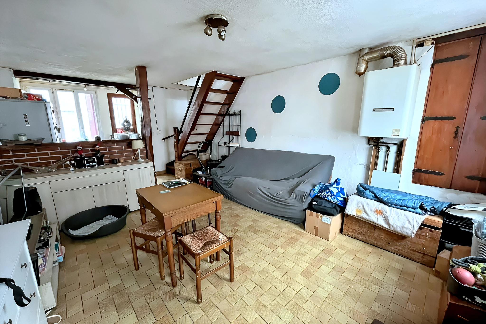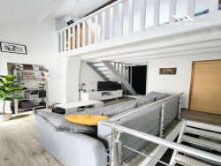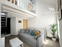 A l'étage, un salon cosy baigné de lumière invite à la détente, complété par une salle d'eau avec WC. La mezzanine accueille un espace nuit intime, parfaitement optimisé.