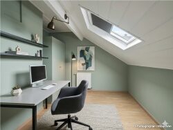 Au deuxième : - Un bureau de 8m2 (13m² au sol) - Une chambre de 13m² (20m² au sol) avec potentiel : actuellement 2 lits, 2 bureaux et dressing