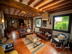 Le séjour, chaleureux avec ses poutres anciennes et sa cheminée à foyer fermé, s'ouvre naturellement d'un côté sur la cuisine et de l'autre sur la véranda, créant une circulation fluide et conviviale.