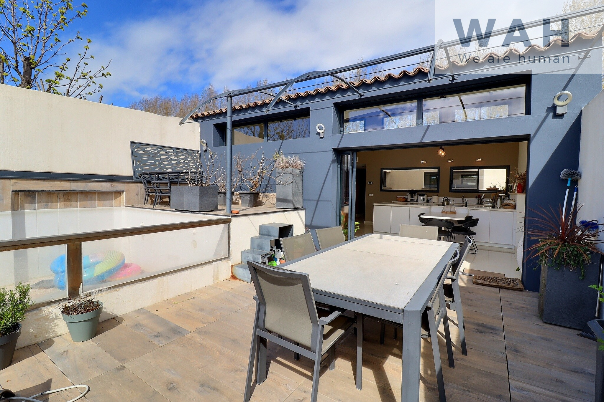 Au premier étage, une pièce de accueil, un espace de transition offrant l'accès à une terrasse de 50 m2, une grande pièce non chauffée servant de buanderie, et un logement privé avec 2 chambres, 1 salle de bains, une salle d'eau, un Wc indépendant, une salle à manger spacieuse, un salon et une cuisine entièrement équipée avec accès à une charmante terrasse ombragée.