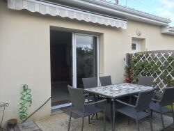 La maison bénéficie également d'une terrasse en bois couverte donnant sur un joli jardin clos et arboré.