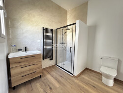 - Entrée, salle de douche avec toilettes et fenêtre de 9,2 m² neuve. Pièce de vie de 34,4 m² avec cuisine aménagée donnant sur le jardin, ensuite nous avons un dégagement qui dessert deux chambres de 17,2 et 13,6 m² dont l'une avec accès sur le jardin.