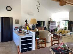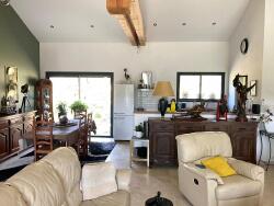 46000 Cahors à 10 minutes au nord, maison mitoyenne de plain-pied de près de 130m², 5 pièces, 3 chambres, construite en 2023, en parfait état et avec de belles prestations. Terrain de 5000m² environ. Salon salle à manger et cuisine ouverte 74m², 3 chambres de 11.2 ; 13.5 et 14 m², salle de bain et wc séparés, cellier-buanderie. Chauffage au sol par pompe à chaleur air/eau, volets roulants électriques, isolation par l'extérieur. Fosse septique. Taxe foncière 800 euros environ. DPE B (Montant moyen estimé des dépenses annuelles d'énergie pour un usage standard établi à partir des prix de l'énergie le 01/01/2021 : entre 605 et 819 euros).