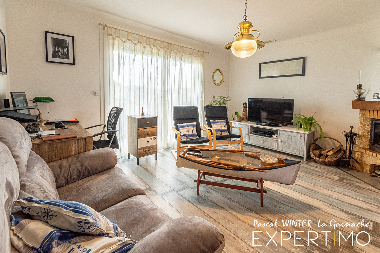 La maison principale se compose d'une pièce de vie lumineuse, d'une cuisine indépendante aménagée et équipée avec arrière-cuisine, de deux chambres, d'une salle d'eau et d'un WC indépendant. L'organisation est simple, fonctionnelle et intégralement de plain-pied, adaptée à un usage quotidien pratique. Les menuiseries PVC double vitrage, la VMC simple flux et le raccordement au tout-à-l'égout assurent une base technique cohérente.