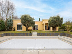 Située sur la commune prisée de Genas, cette maison de plain-pied déploie ses 250 m² habitables au coeur d'un terrain paysager de 1 453 m². Véritable havre de paix, cette propriété singulière se distingue par ses volumes généreux et son agencement fluide, offrant un cadre de vie idéal agrémenté d'une piscine et d'un pool house. L'entrée révèle une pièce de vie magistrale où l'architecture privilégie la lumière et l'espace. Le vaste salon, souligné par des colonnes de marbre et des détails soignés, s'ouvre intégralement sur l'extérieur grâce à de larges baies vitrées, abolissant la frontière entre intérieur et jardin. La cuisine d'architecte, résolument contemporaine avec son îlot central, s'intègre avec élégance dans cet espace de réception. Côté nuit, l'agencement propose quatre chambres confortables, dont une suite parentale d'exception. Cette dernière, véritable sanctuaire privé, bénéficie d'un accès direct sur la verdure environnante. Un garage hors normes de 200 m² complète les prestations intérieures, offrant des possibilités de stockage ou d'aménagement rares sur le marché. A l'extérieur, le jardin clos invite à la sérénité. La terrasse en pierre accueille une piscine aux lignes épurées, prolongée par un pool house dont l'architecture en arches rappelle les demeures méditerranéennes. Cet espace de détente, à l'abri des regards, constitue le point d'orgue de la propriété. L'environnement immédiat garantit un calme absolu tout en restant à proximité immédiate des commodités de Genas, notamment les établissements scolaires et les commerces de qualité qui font la réputation de ce secteur résidentiel. Cette maison de plain-pied incarne l'esprit des biens recherchés par Espaces Atypiques : une signature architecturale forte alliée à des prestations haut de gamme. Sa conception horizontale et ses surfaces annexes exceptionnelles en font un lieu de vie unique et rare. DPE de classe D. Contact : Axel - Axel Augier (EI) Agent Commercial - Numéro RSAC : 530 152 388 - Lyon.