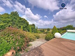 À l'extérieur, le terrain paysagé entièrement clos et soigneusement entretenu, offre plusieurs espaces de détente et de réception, une piscine avec sa terrasse, ainsi qu'une yourte de 36 m² totalement ouverte sur une vue dominante privilégiée. Un garage attenant vient parfaire ce bien.