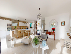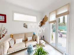Léonie de l'agence Immojoy voius propose dans la commune d'Ouveillan, village avec toutes les commodités et à proximité de Narbonne et de Béziers, cette magnifique villa 3 faces de 2024, de plain pied, 73m2 habitables sur un terrain de 272m2. Vous serez immédiatement séduit dès l'entrée dans cette maison à la décoration épurée par le volume et l'ensoleillement de sa pièce de vie où vous profiterez de la vue sur le jardin paysagé sans-vis-vis, rare aujourd'hui dans les lotissements. Sa cuisine équipée avec îlot central et espace dinatoire vous permettra de prendre vos repas. Vous retrouverez la suite parentale avec dressing aménagé et salle d'eau avec meuble double vasques et douche à l'italienne. Deux entrées permettent d'accèder à cette salle d'eau, idéal quand vous recevez. Un wc indépendant avec lave mains. Un garage avec le nécessaire pour la machine à laver ainsi que le thermodynamique. Vous aurez la possibilité de créer une deuxième chambre dans le garage si vous le souhaitez et de surélevé d'un niveau. Nous avons réalisé une image 3D pour que vous puissiez vous rendre compte de la chambre dans le garage après le changement de la porte de garage en baie vitrée. La maison bénéficie de très belles prestations et d'une borne pour véhicule électrique.