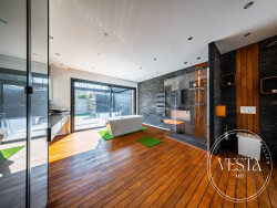 Dès l'entrée, la maison dévoile des espaces ouverts et lumineux. La pièce de vie de 54 m², véritable coeur de la maison, bénéficie d'une impressionnante hauteur sous plafond et d'une charpente apparente qui renforcent son caractère. Les larges baies vitrées créent une continuité fluide entre intérieur et extérieur, offrant une agréable sensation d'espace et de liberté.