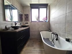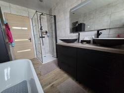 - au rez-de-chaussée: hall d'entrée avec vestiaire, spacieuse pièce de vie ouverte 53m² (cuisine entièrement équipée avec ilôt central 20m² donnant sur salle à manger 33m² avec poele à granulés), immense salon/séjour cathédrale 70m² avec cheminée insert et coin billard, dressing intégré, salle de bains (avec baignoire et douche et double vasque), buanderie/chaufferie, WC indépendants avec lave mains;